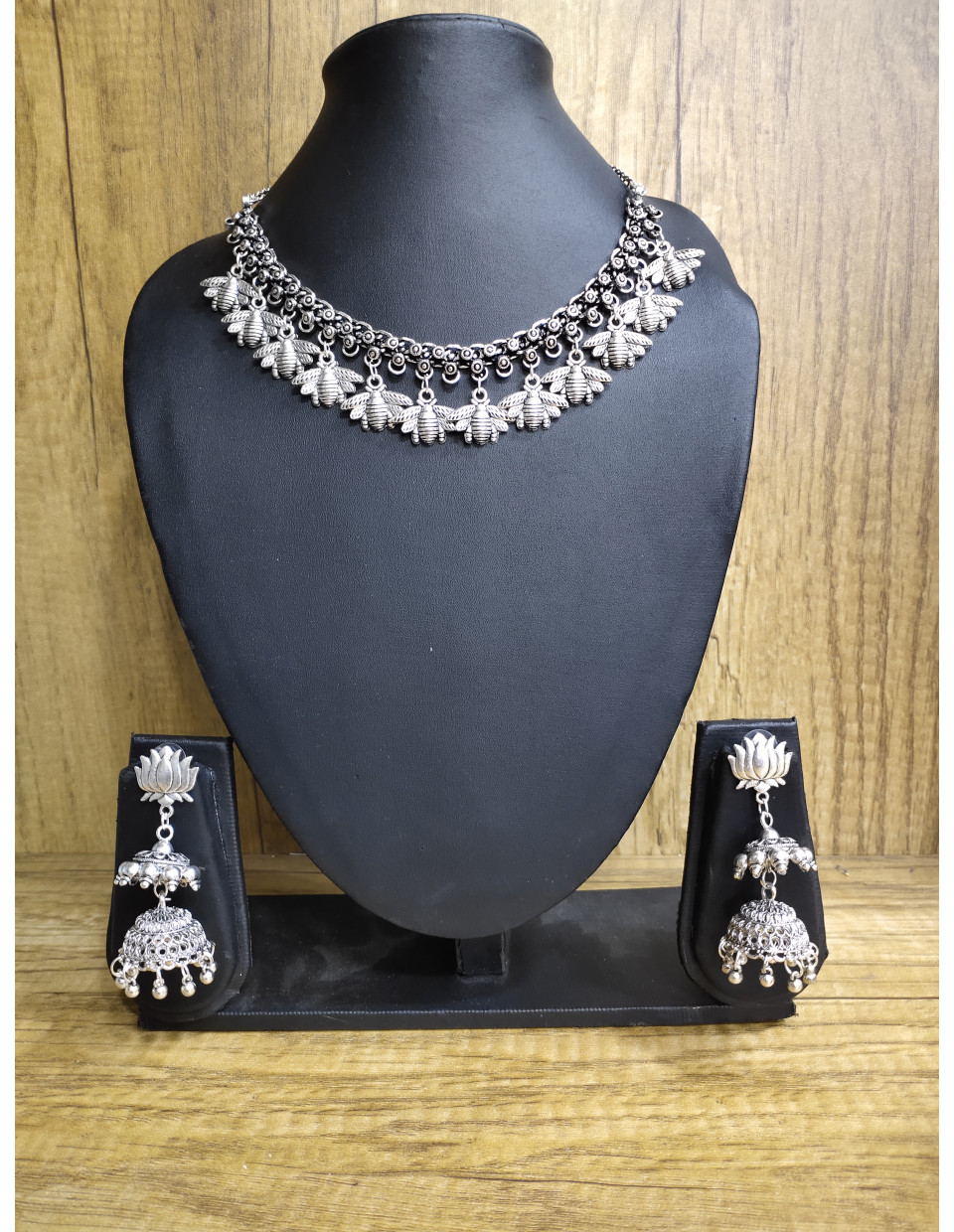 Fashionable Silver Oxidize Neck Piece With Earring (JN21J16)