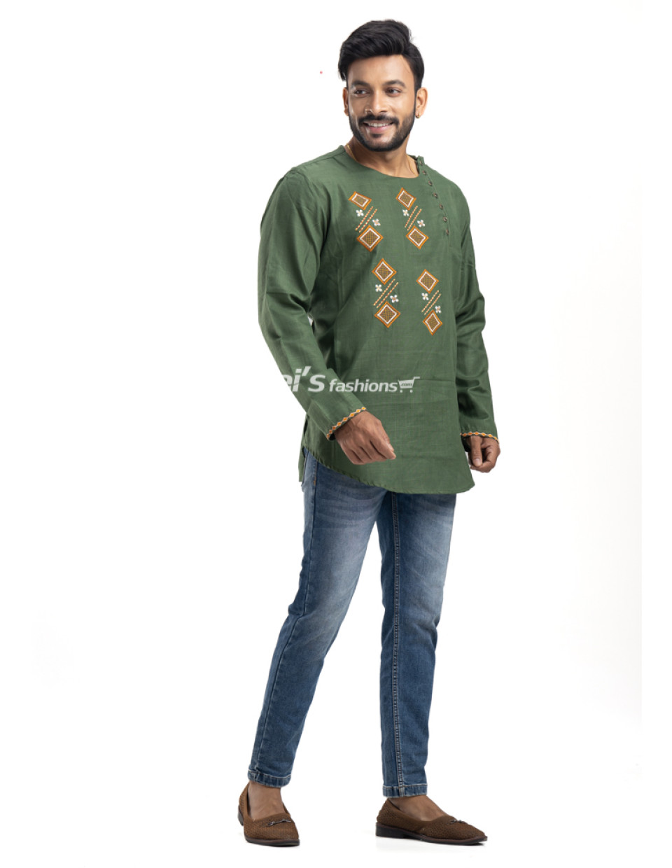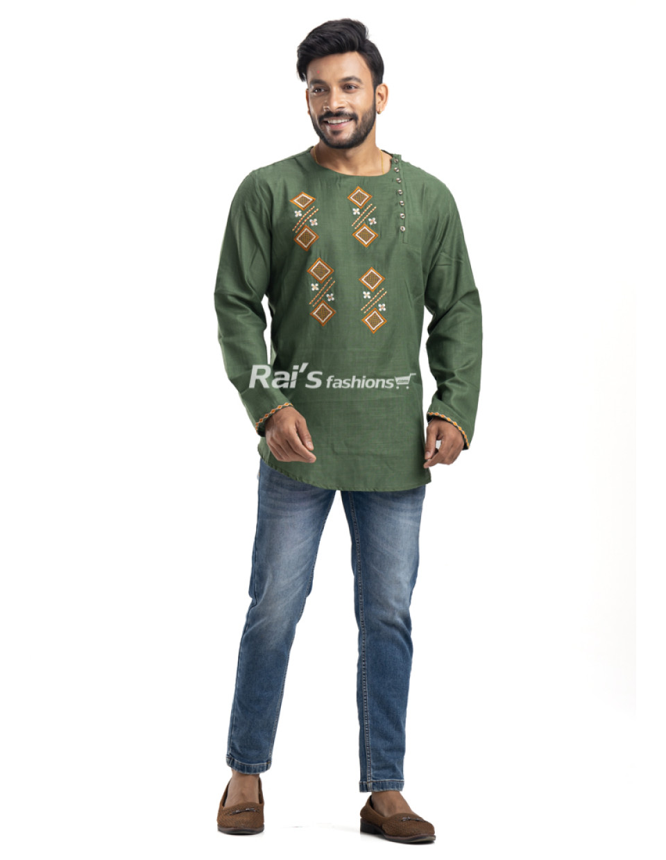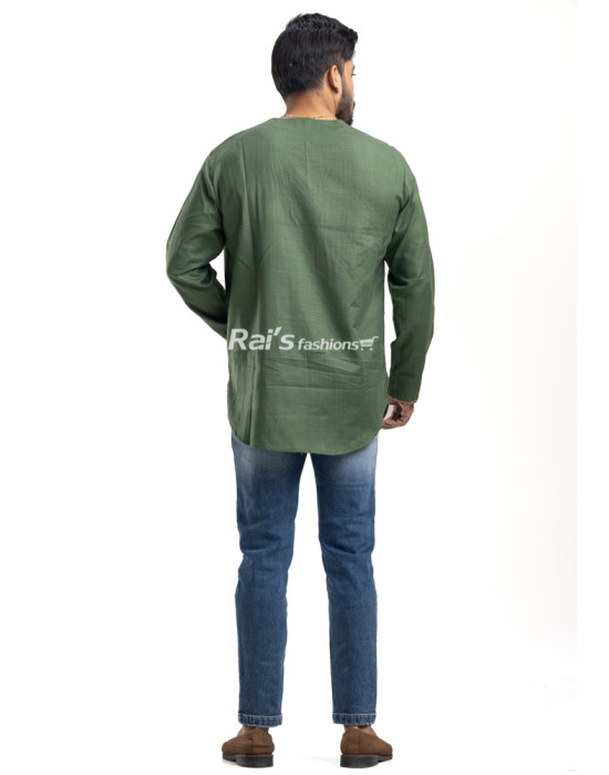 Hunter Green Khadi Cotton Men Short Kurta With Embroidery Work (KRP3)