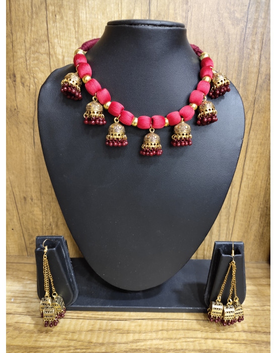 Silk Balls With Golden Oxidize Jhumka Combine Handcrafted Jewellery And Long Chain Pattern Earrings (KR170)