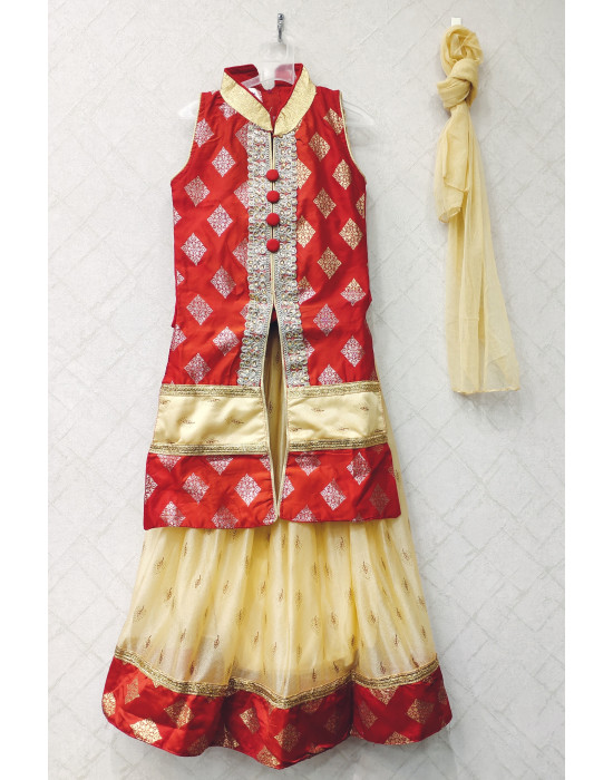Silk Red Kids Kurti Skirt Set With All Over Golden Butta Weaving And Stone Work (KRB16)